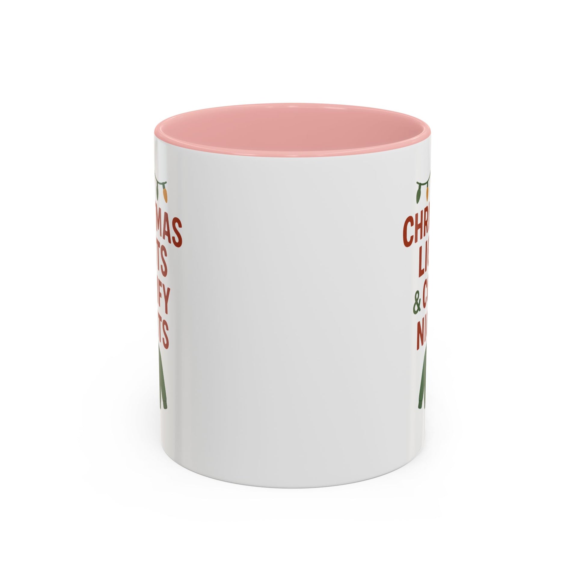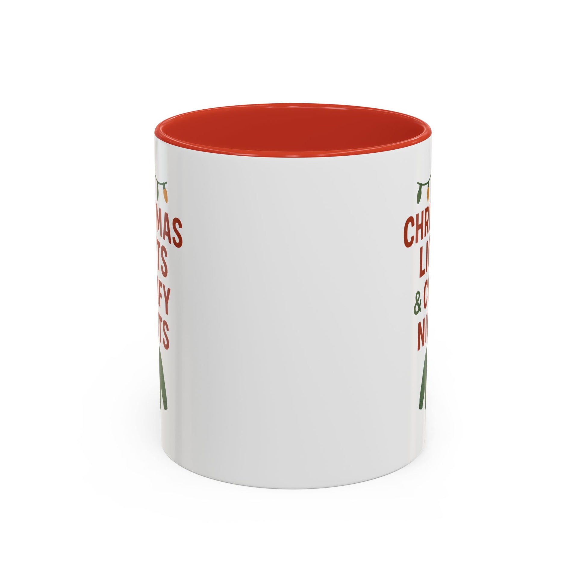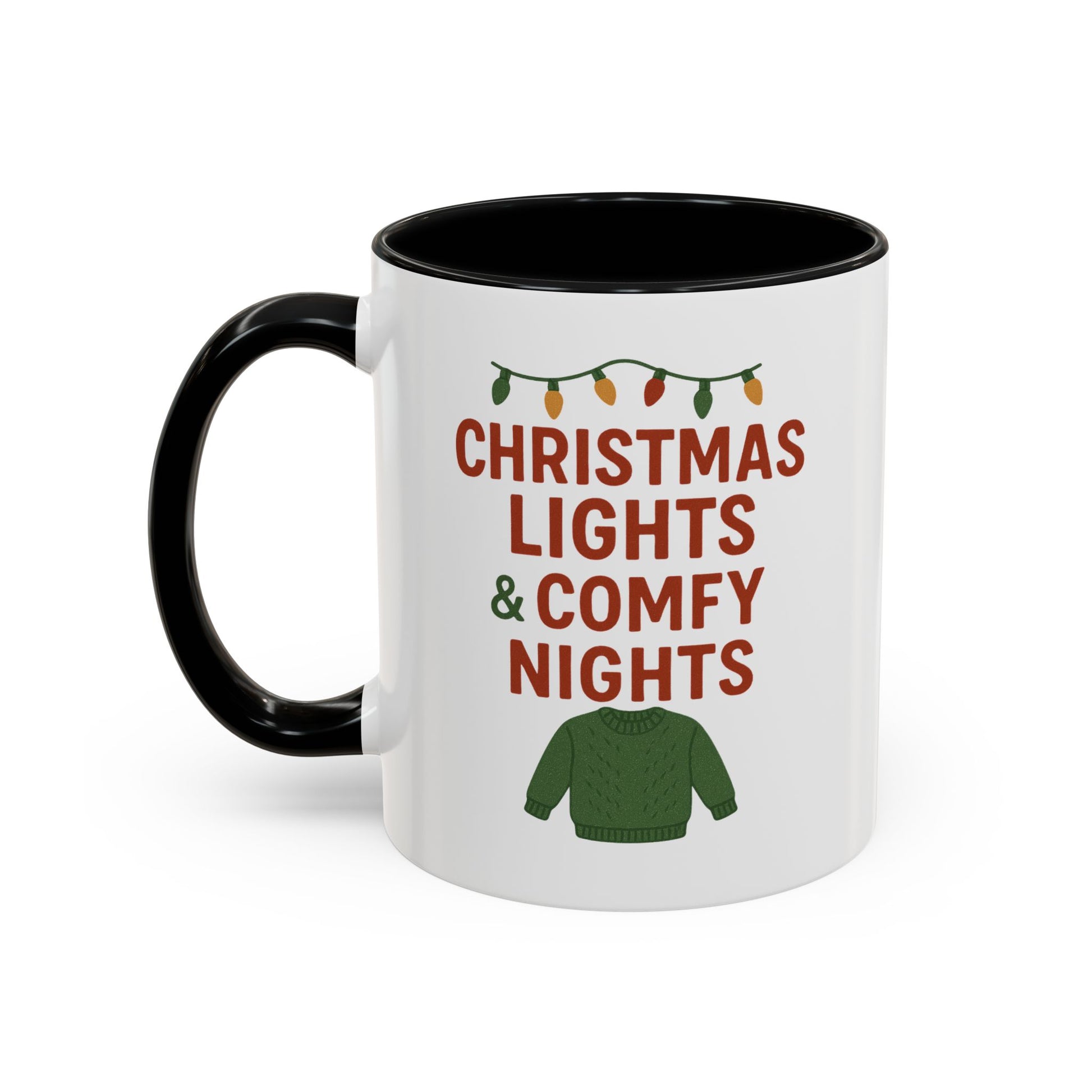 Warm, cozy mornings wrapped in twinkling lights—that’s the mood this ceramic mug brings. Crisp red and forest-green artwork reads “CHRISTMAS LIGHTS & COMFY NIGHTS” above a knit sweater icon and a string of holiday bulbs, printed with vivid color on a glossy white canvas. The colored interior and handle add playful contrast so every sip feels festive, whether you’re easing into a slow winter day or lingering over after-dinner conversation. Sturdy and practical, it holds enough cocoa for curled-up evenings and stands up to everyday use while keeping that seasonal charm on your counter or desk.
