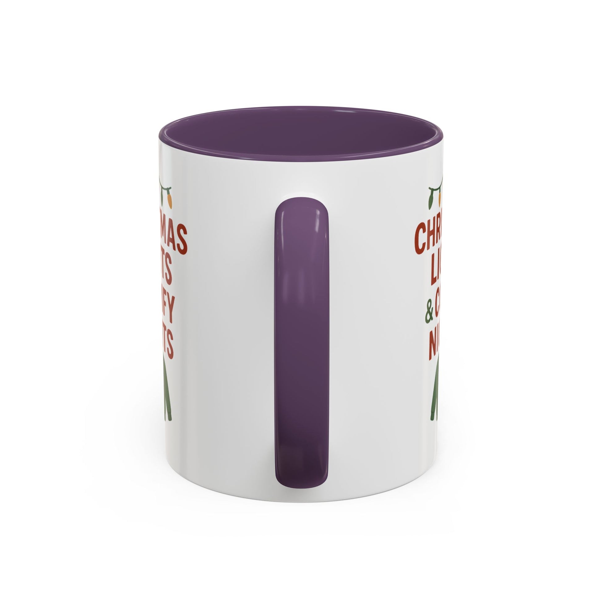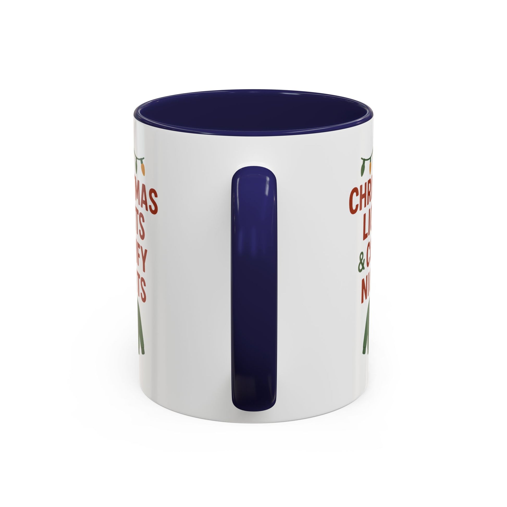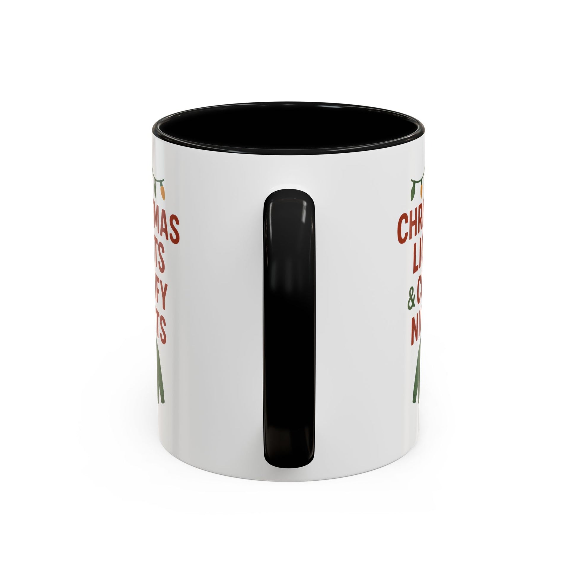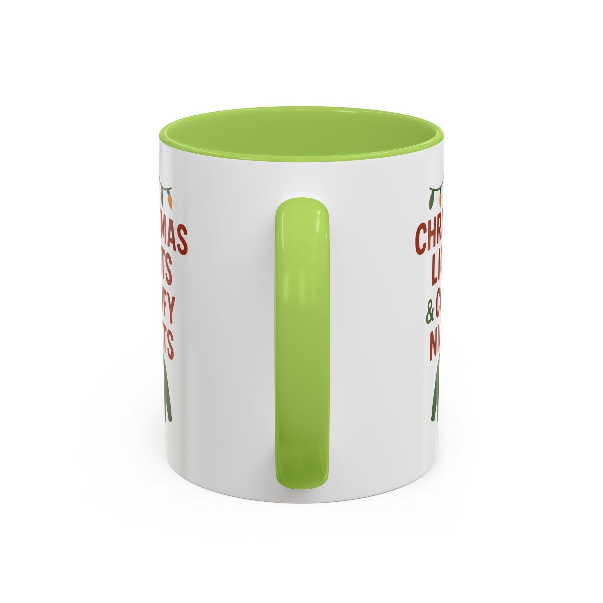 Warm, cozy mornings wrapped in twinkling lights—that’s the mood this ceramic mug brings. Crisp red and forest-green artwork reads “CHRISTMAS LIGHTS & COMFY NIGHTS” above a knit sweater icon and a string of holiday bulbs, printed with vivid color on a glossy white canvas. The colored interior and handle add playful contrast so every sip feels festive, whether you’re easing into a slow winter day or lingering over after-dinner conversation. Sturdy and practical, it holds enough cocoa for curled-up evenings and stands up to everyday use while keeping that seasonal charm on your counter or desk.