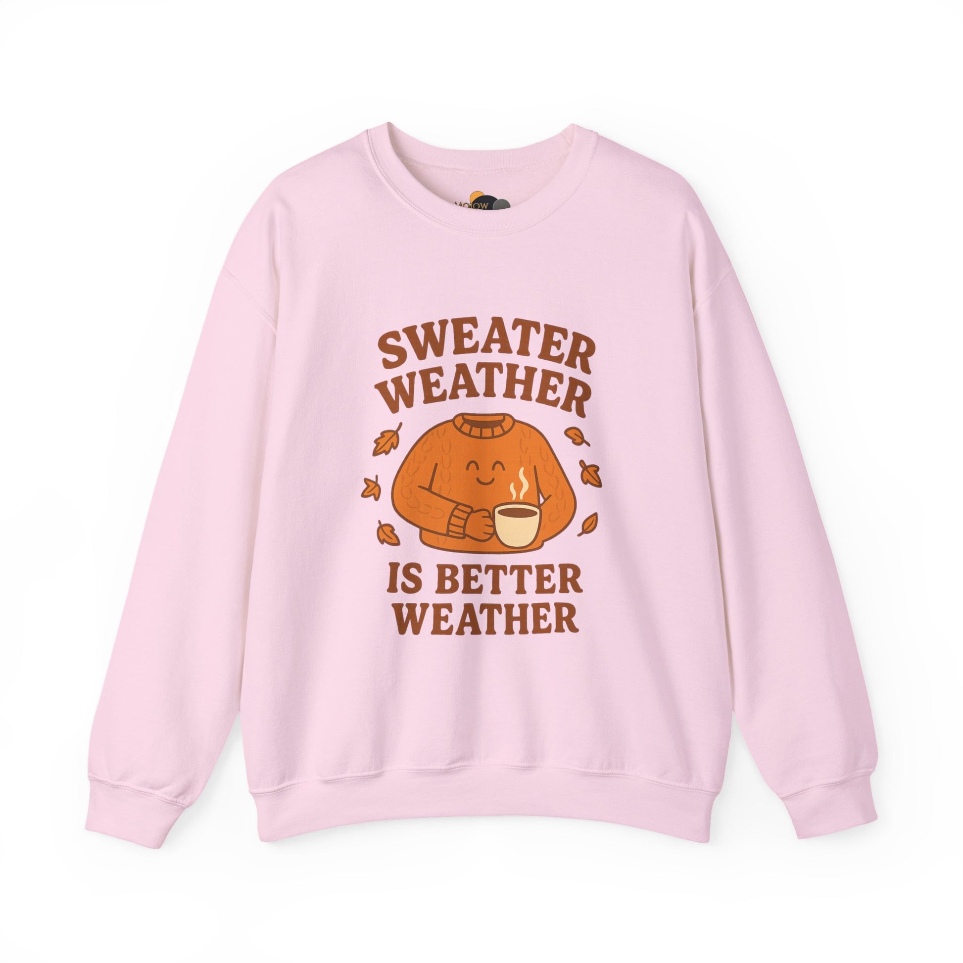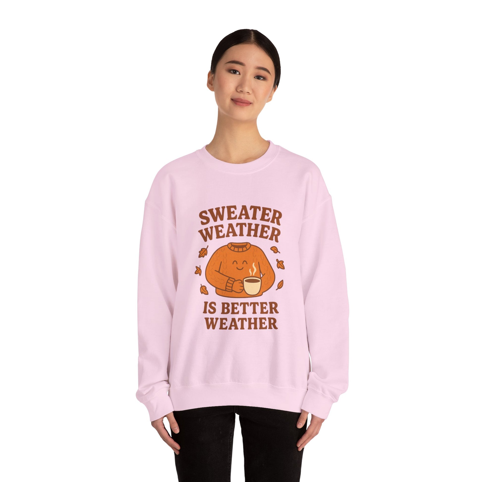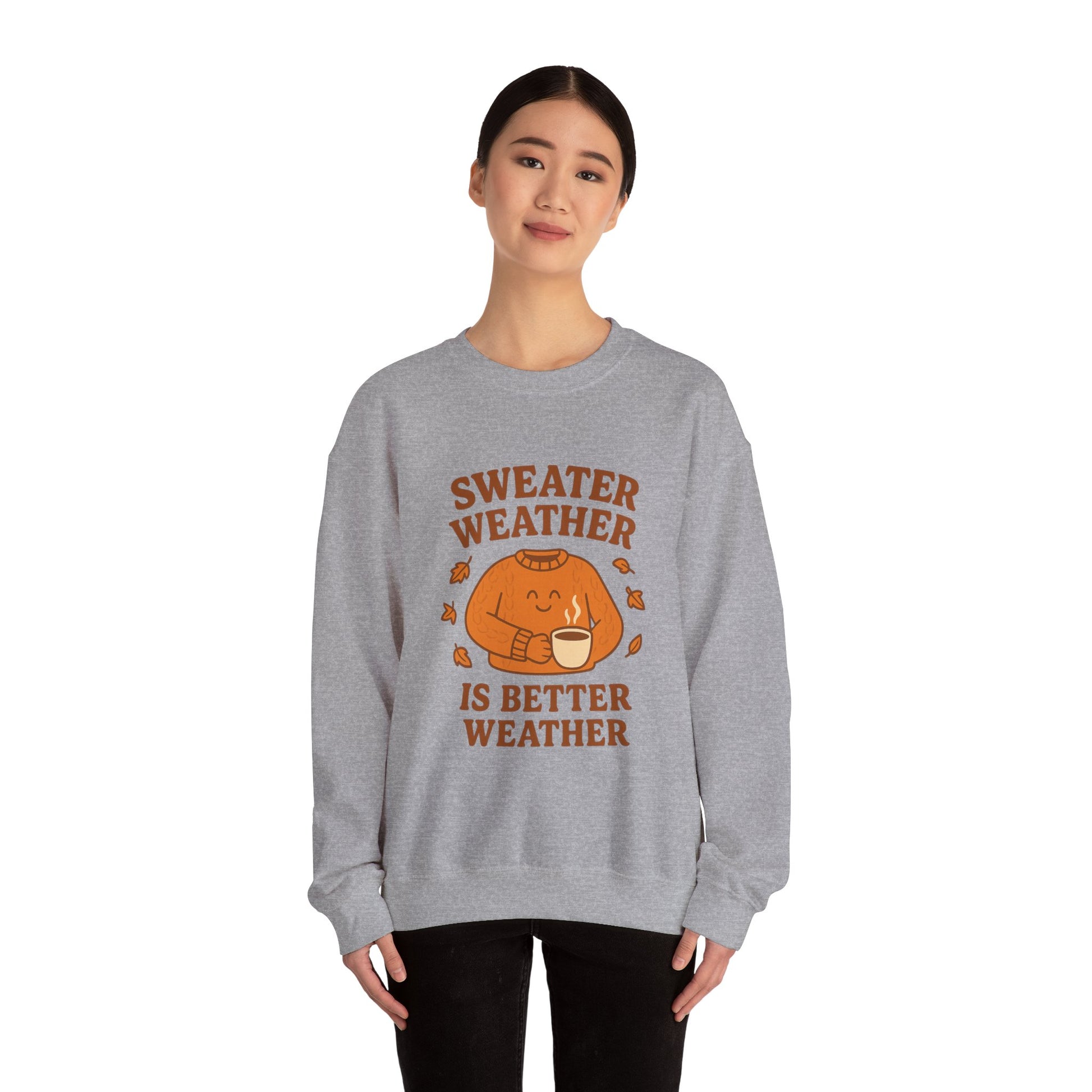 Embrace the coziness of the seasons with this Unisex Heavy Blend™ Crewneck Sweatshirt. Designed for those chilly days, it radiates warmth and comfort, making it an essential addition to your wardrobe. Its delightful design captures the essence of 'Sweater Weather is Better Weather', evoking a sense of joy and relaxation that resonates with all who adore fall and winter vibes. Perfect for casual outings, cozy nights in, or festive gatherings, this sweatshirt is relevant for holidays like Thanksgiving, Christmas, and any chilly celebration where comfort meets style. Ideal for adults who appreciate quality and sustainability, it wraps you in a feel-good atmosphere while also being ethically made. Experience the blend of style and comfort, turning every moment into a cozy occasion.