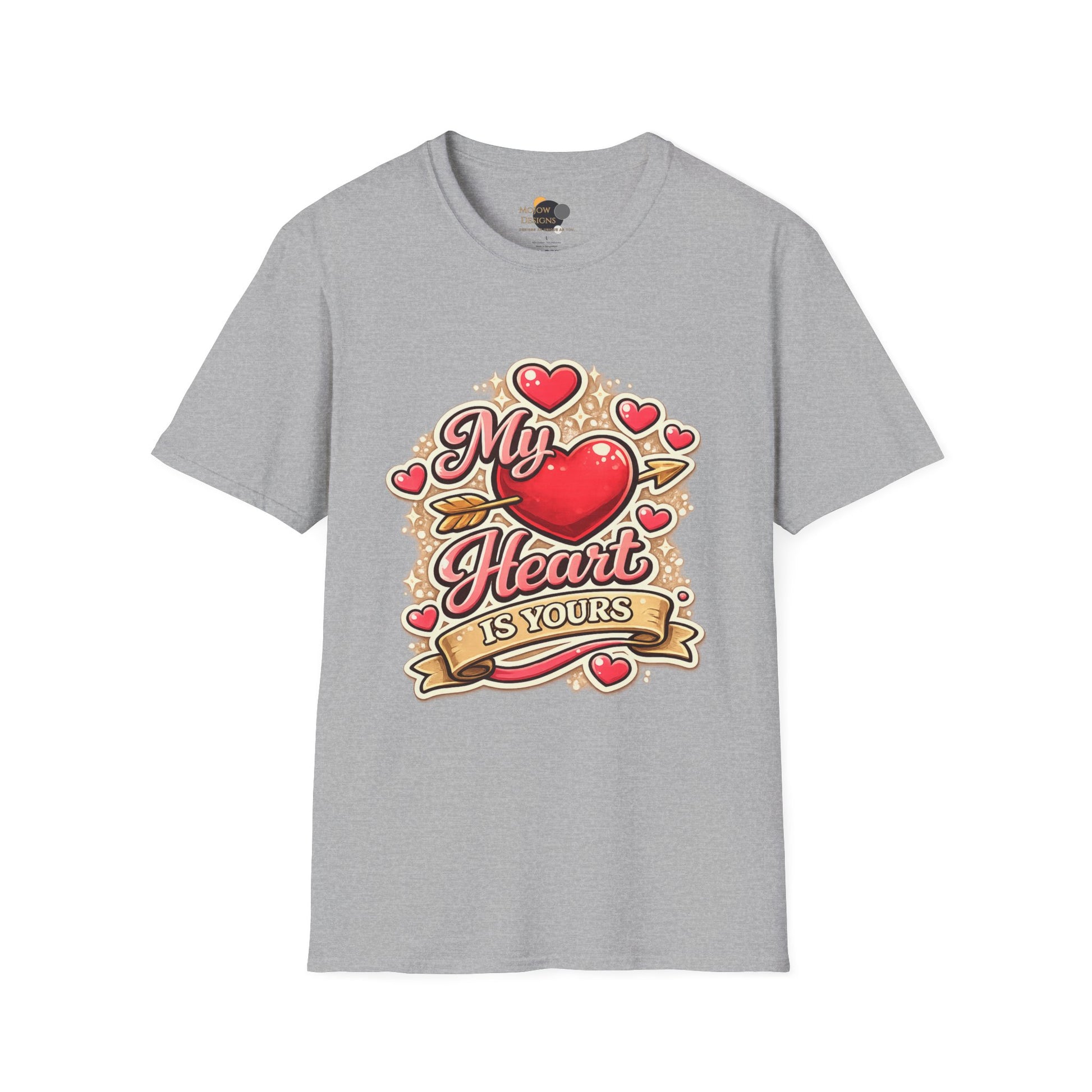 Soft, casual, and full of heart — this lightweight crew tee carries a warm, hand-drawn graphic that reads “My Heart Is Yours.” The vintage-inspired design mixes bold red hearts, flowing script, and a worn banner for a nostalgic, tattoo-style look. Wear it on quiet mornings with coffee, out for a low-key date, or layered under a jacket when you want to send a subtle, sincere message. The shirt’s smooth, breathable cotton keeps the print crisp while staying comfortable all day. It’s for people who speak gentle romance without saying too much.