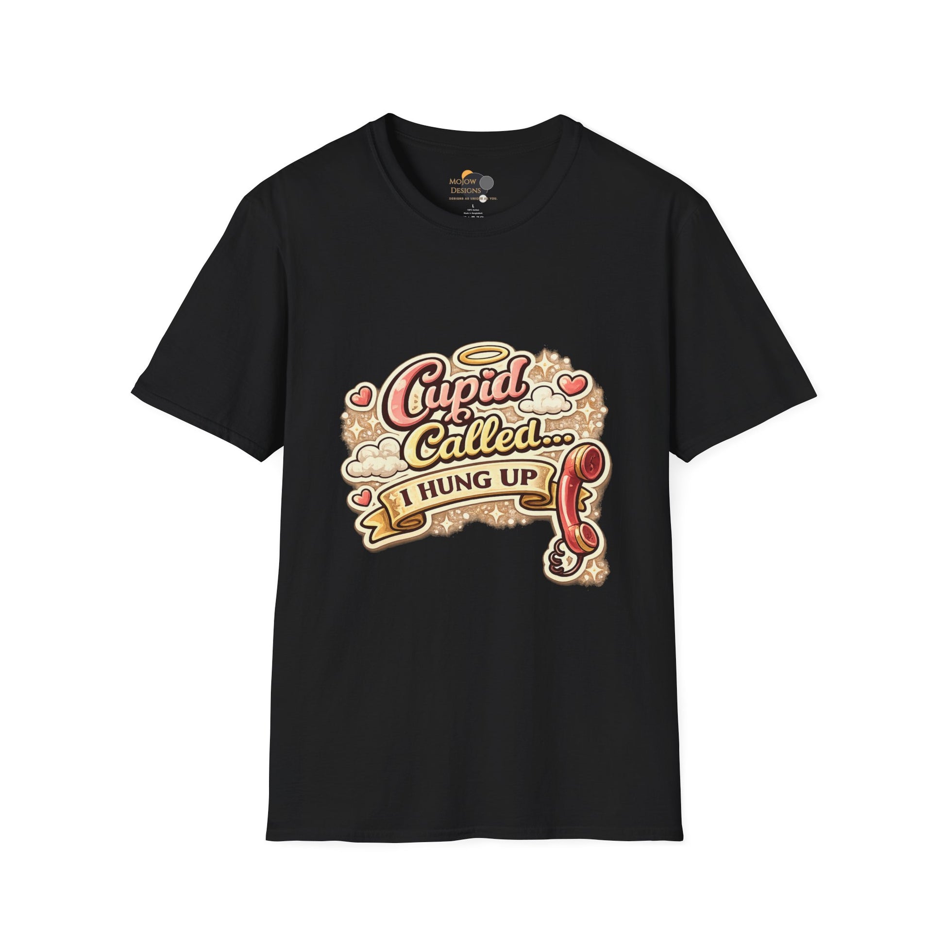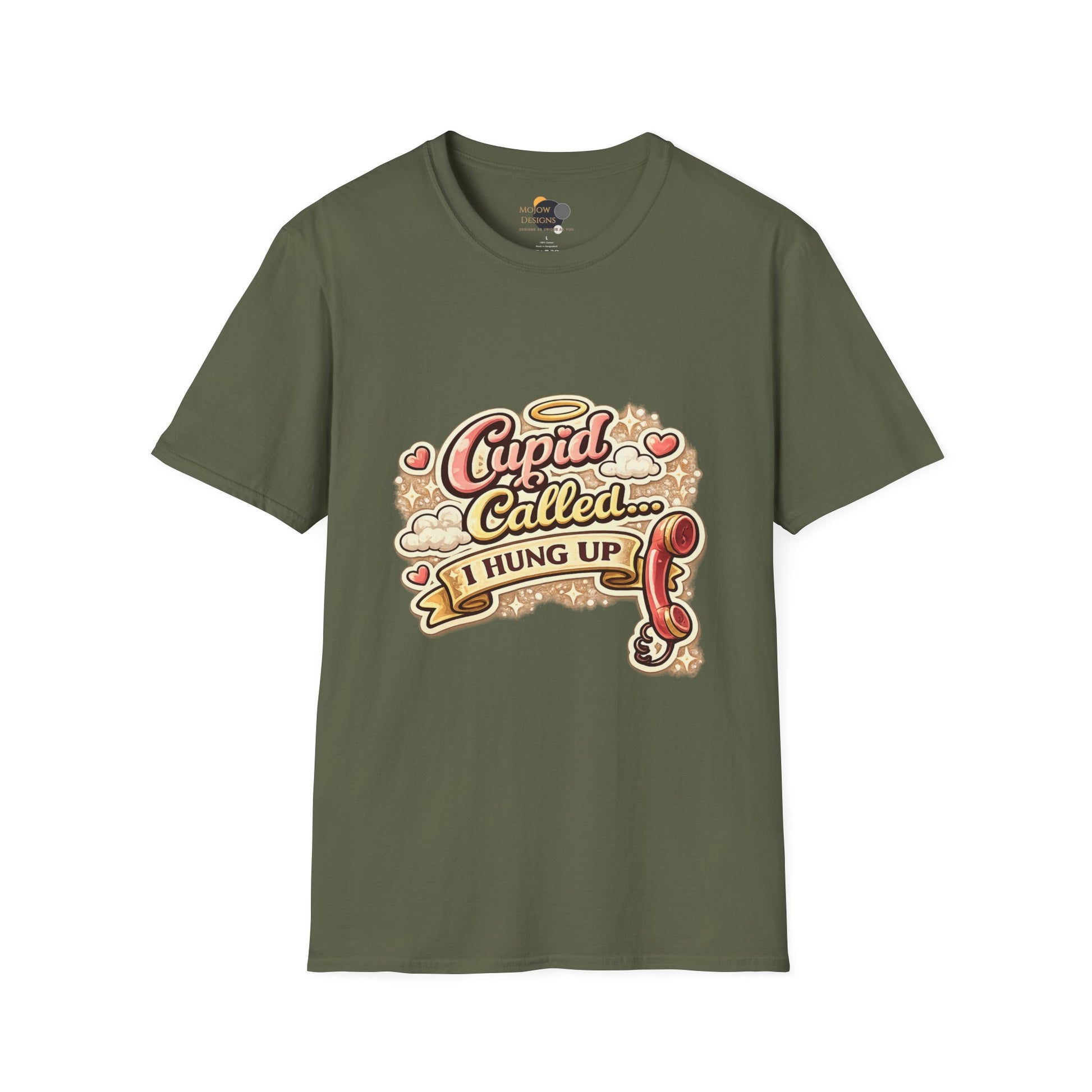 A soft, lightweight crew tee that wears like a warm joke between friends. The shirt carries a playful retro design—’Cupid called... I hung up’—with vintage reds, soft golds and cartoon hearts arranged like a ruined romance postcard. It sits comfortably on the shoulders and drapes cleanly thanks to tubular knit construction and a classic crew neckline. Wear it when you want to be quietly sarcastic at a Valentine’s get-together, laugh with friends over drinks, or layer under a jacket for an offbeat date night. The fabric is breathable year-round, the ribbed collar holds its shape, and the printed artwork uses durable techniques so the colors stay lively wash after wash.