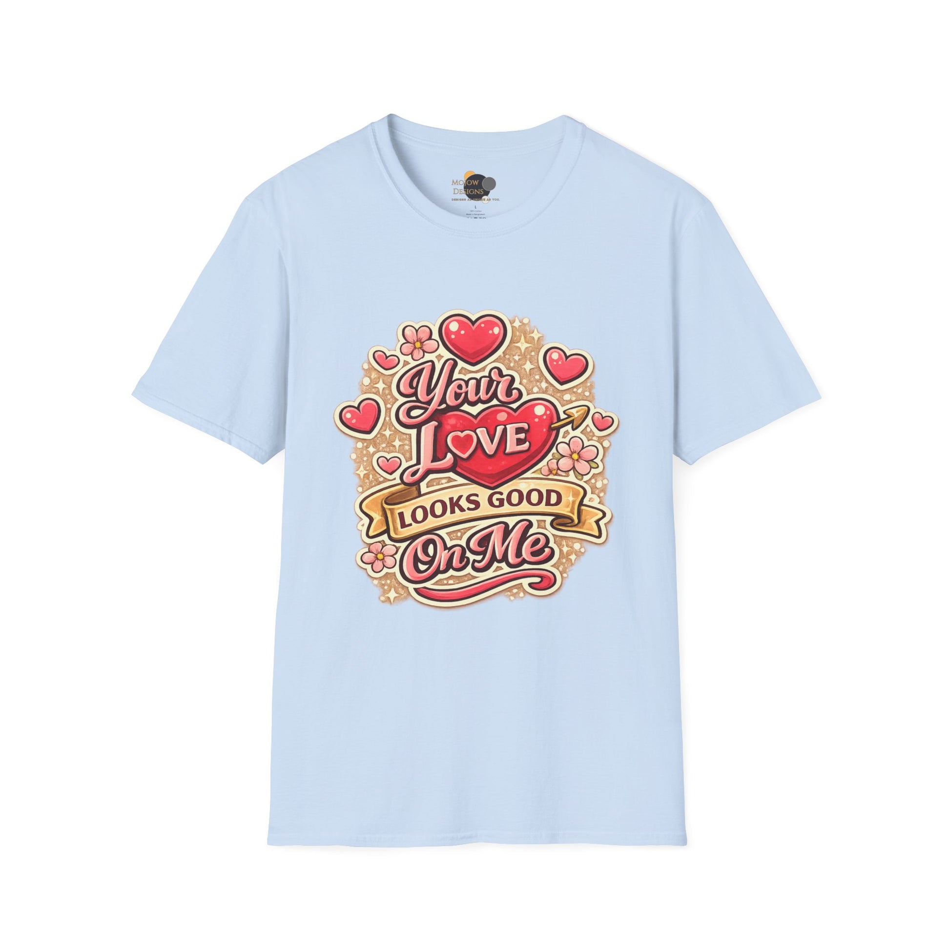 Soft, warm, and a little cheeky — this lightweight tee wears like a cozy secret you can show off. A vintage-inspired badge of hearts and banners reads “Your Love Looks Good On Me,” printed in rich reds and golden tones that pop against a clean white canvas. The shirt sits true to a classic crew fit so it layers easily under jackets or stands alone with rolled sleeves. It’s the kind of shirt that sparks a smile on a date night, raises a laugh at a casual party, or becomes an everyday favorite to remind someone (or yourself) of a playful, confident love.